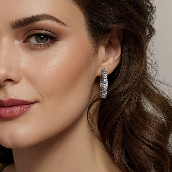 Beaded Pave Style Hoop Earrings in Sterling Silver