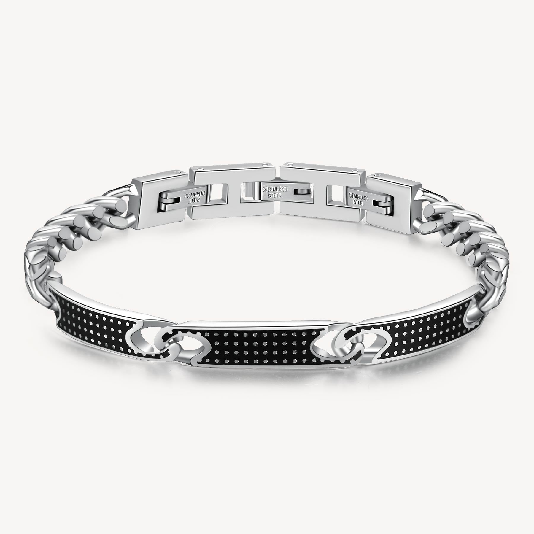 Stainless steel bracelet features three elongated black enamel bars with a link style bracelet. The bracelet is completed to an adjustable 8.25 inch length with removable links.