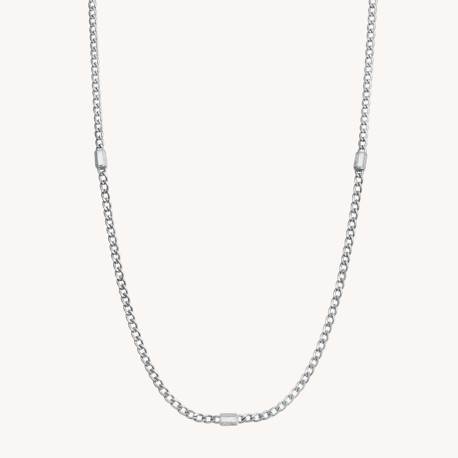 Stainless steel chain link necklace with stainless steel bar accents. The necklace is completed to an adjustable 18.5 inch length.