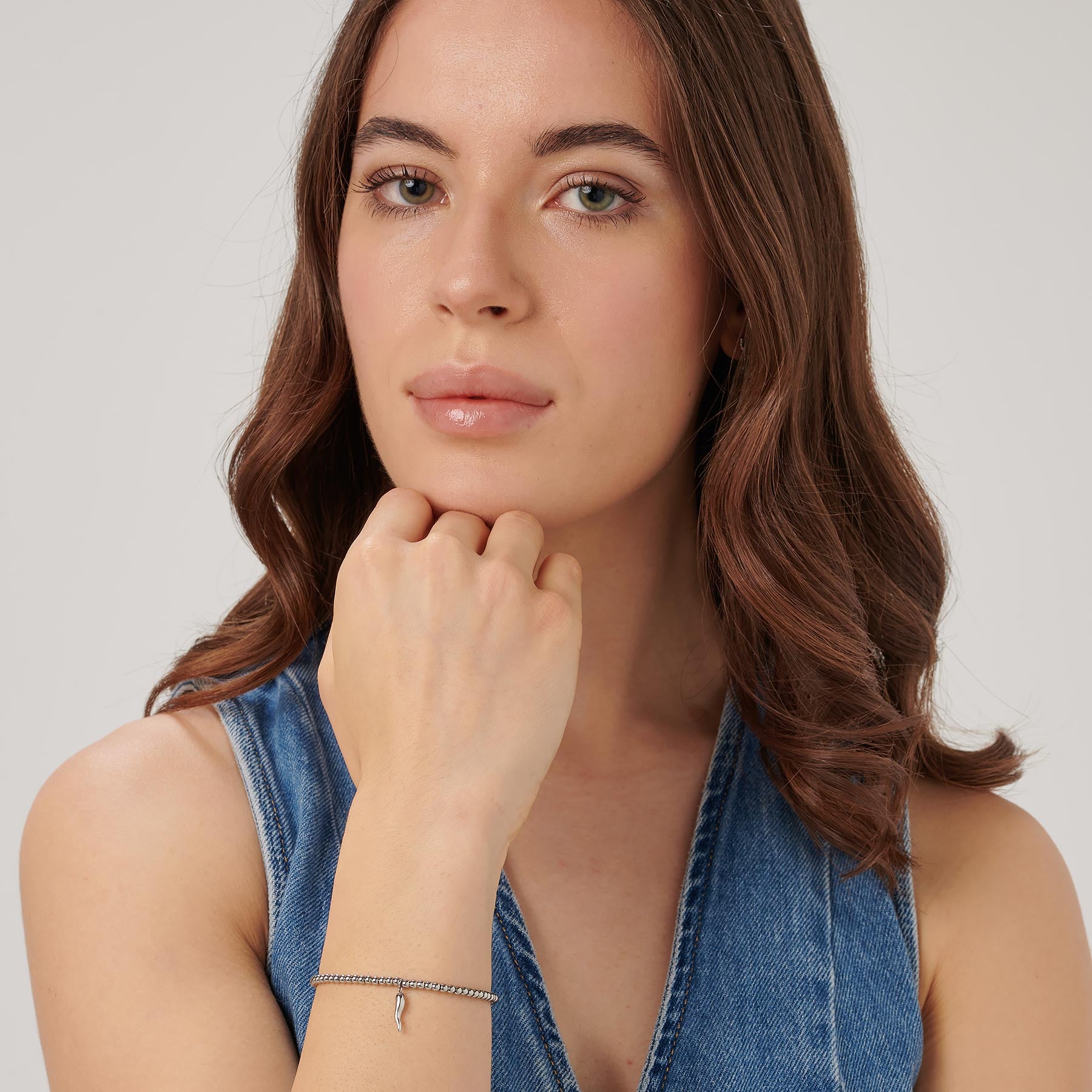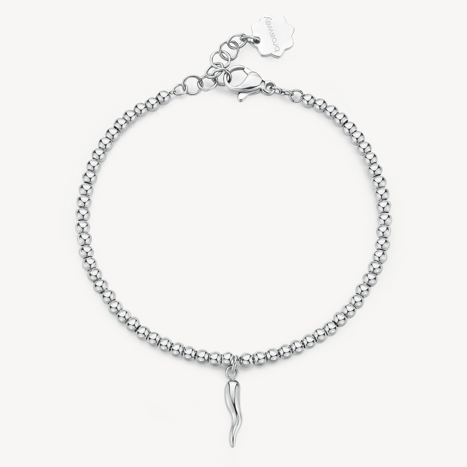 Stainless steel bracelet accented with beads and an italian horn charm. The bracelet is completed to an adjustable 7 inch length.