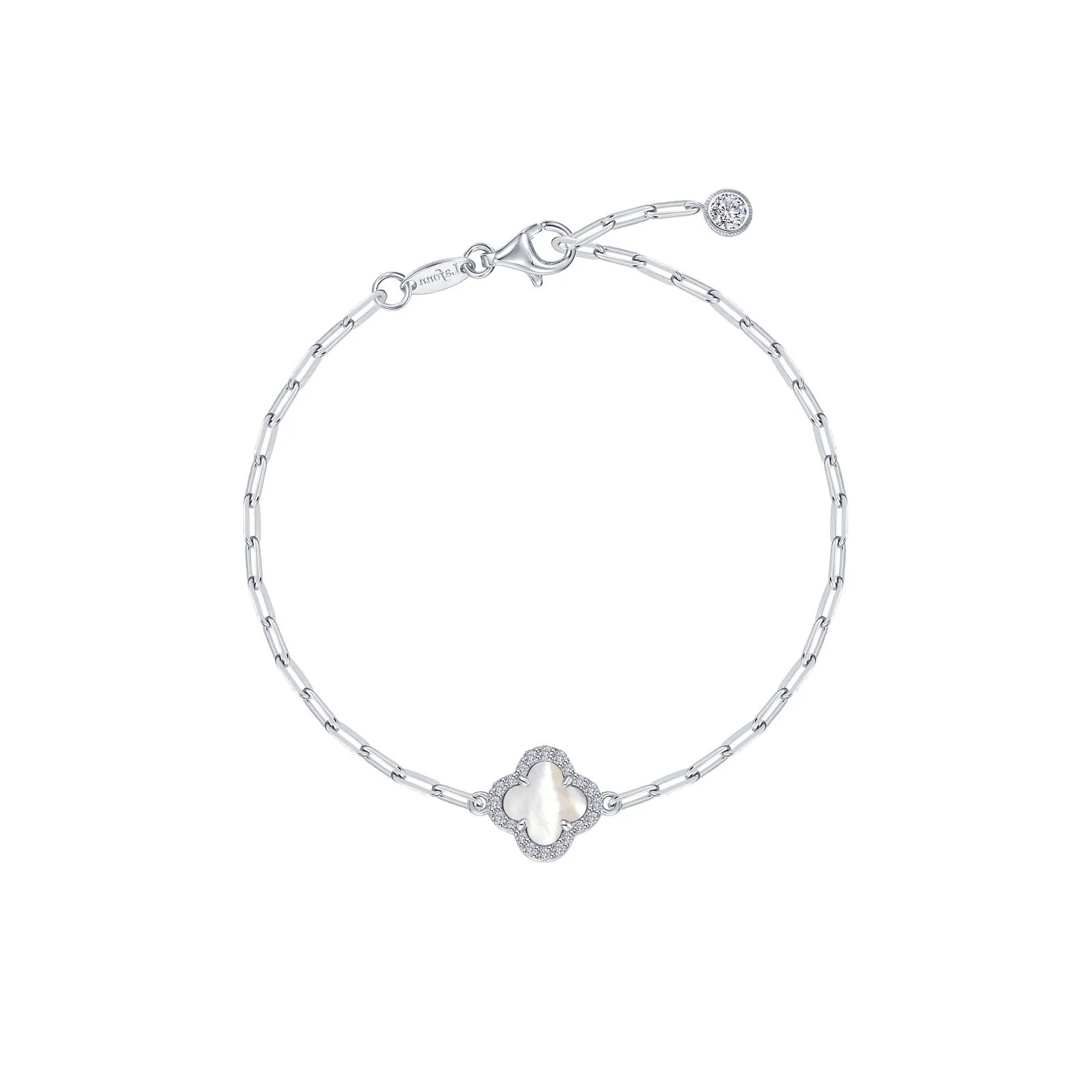 This paperclip bracelet consists of signature Lafonn Lassaire simulated diamonds in a clover design, centered with a fresh water mother of pearl inlay. The bracelet is completed in sterling silver and bonded platinum.