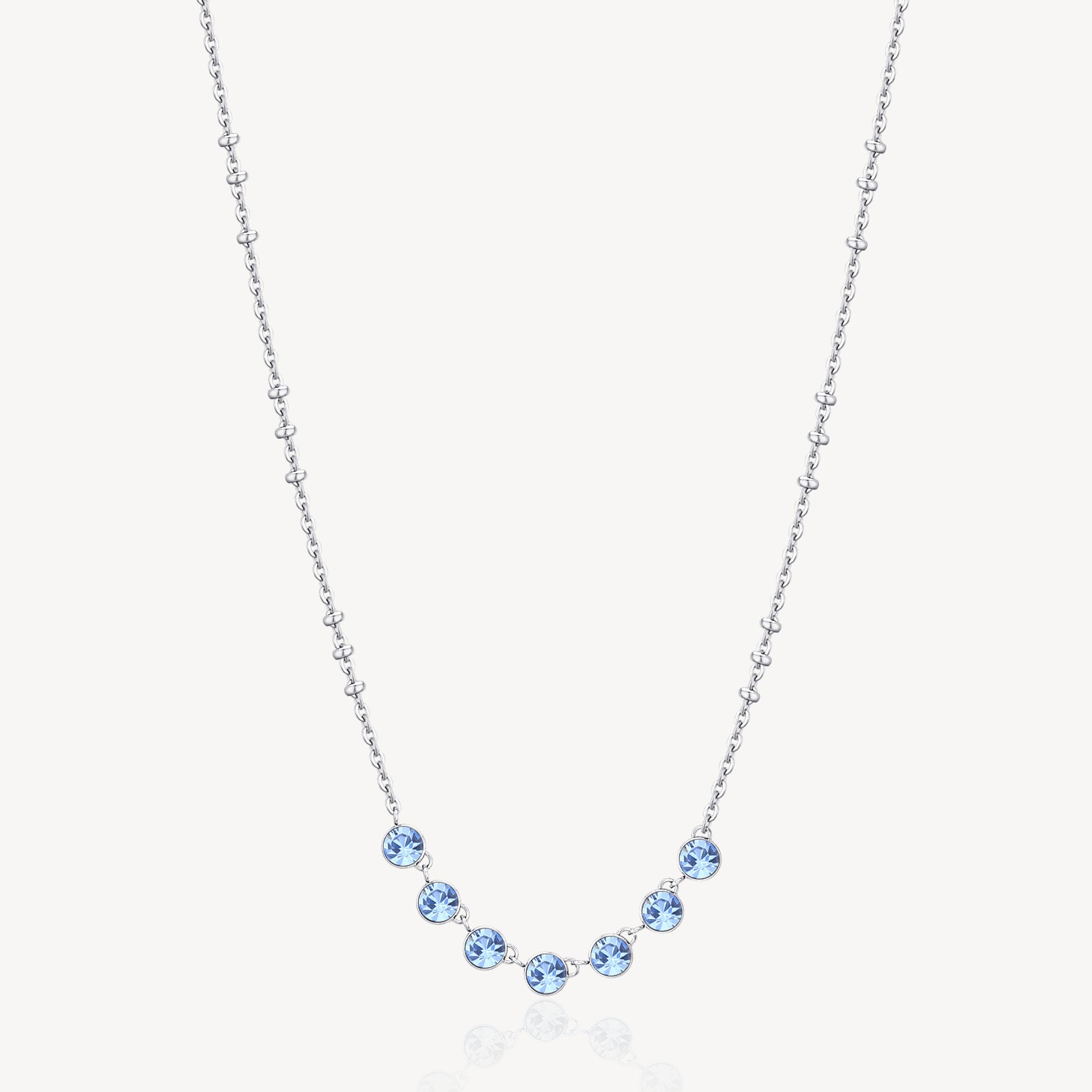Stainless steel necklace bib style necklace featuring round sapphire colored crystals and a beaded chain. The necklace is completed to an adjustable 18 inch length.