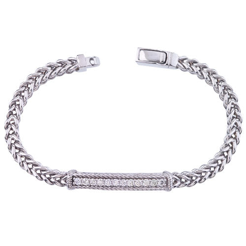 This bracelet is fashioned in a single row design, accented with braided, rectangular bar featuring a single row of round brilliant cut diamonds. The stations are separated by a signature link and completed in 14K white gold.
