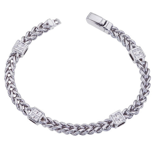 The bracelet is fashioned in a weaved design. There are four square stations, accented with pave set diamonds along the length of the bracelet. The bracelet is held with a signature hidden closure.