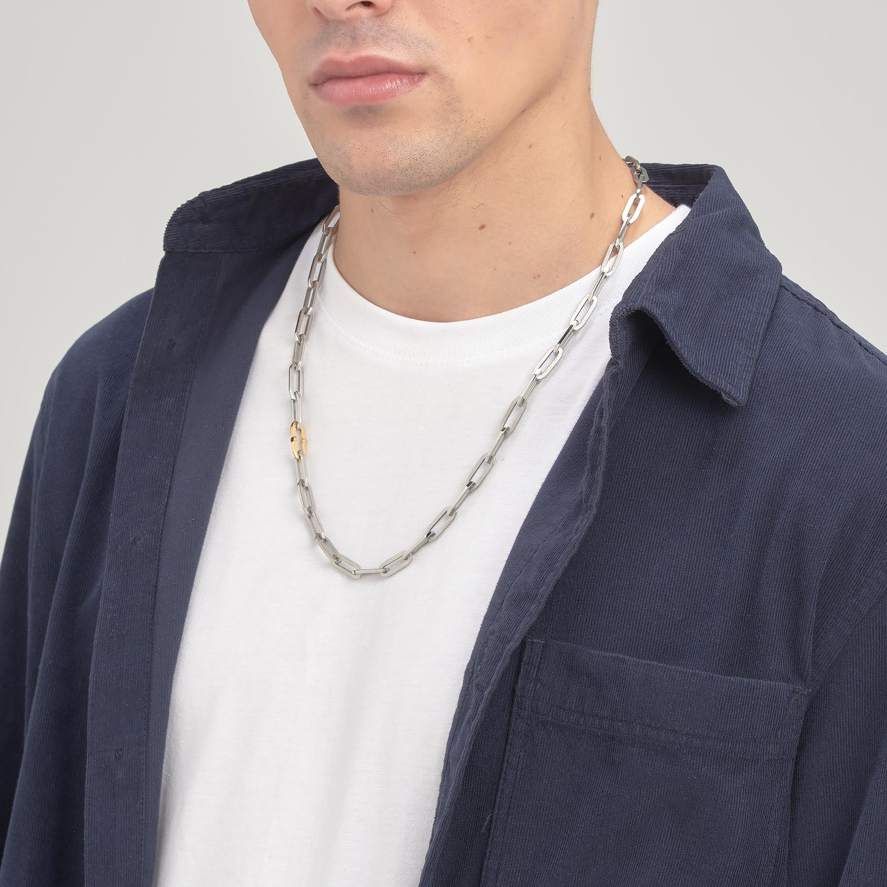 Stainless steel open rectangular lnk chain with a single 14K gold palted link, accented with a jet colored crystal. The necklace is completed to an adjustable 25.5 inch length.