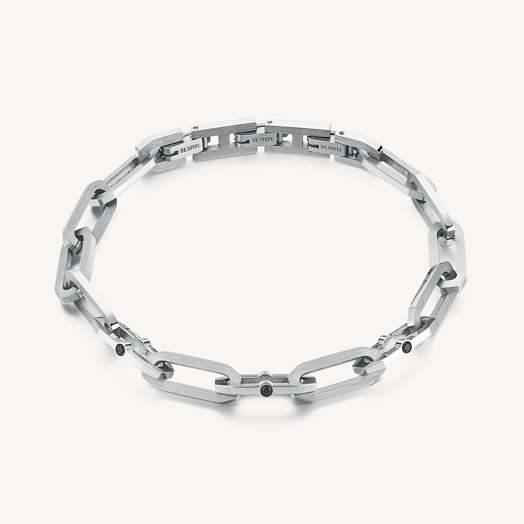 Stainless steel open rectangular link chain bracelet with a satin finish, accented with black crystals. The bracelet is completed to an adjustable 8.5 inch length with removable links.