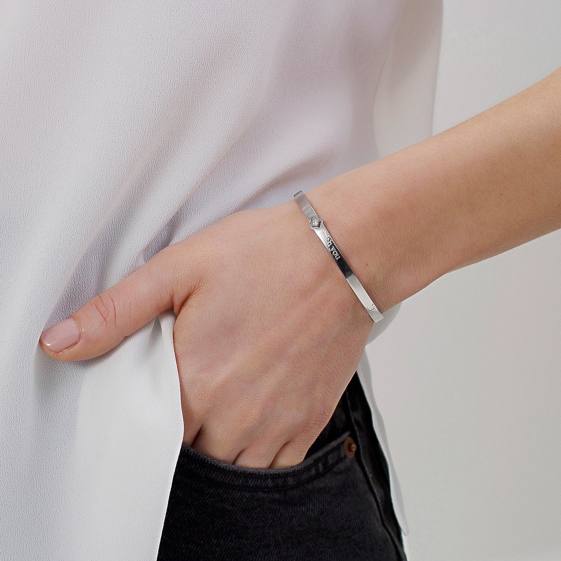 Stainless steel bangle bracelet, accented with a single clear swarovski crystal, engraved 'WITH YOU'. The bangle fits a standard 7-7.5 inch wrist.