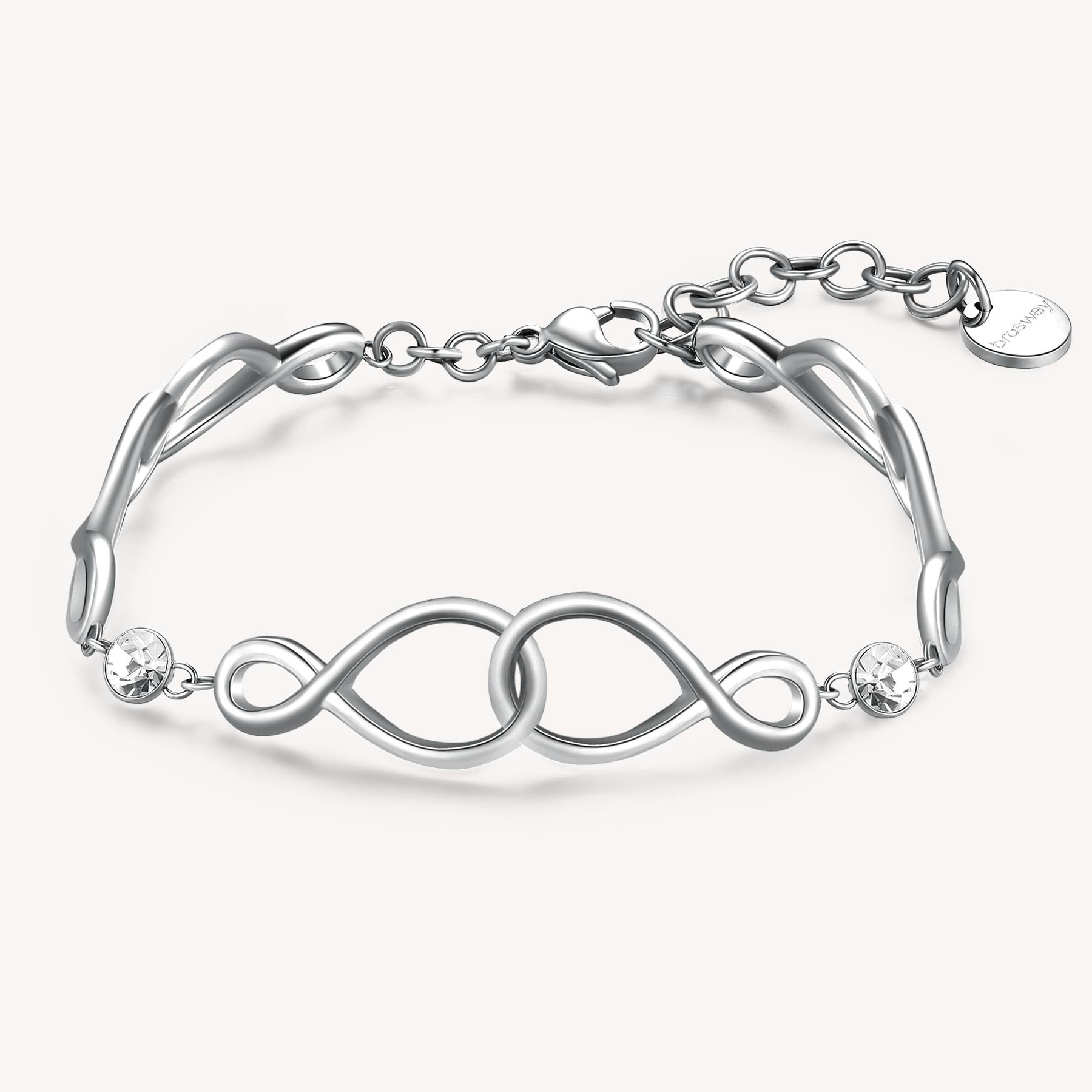 Stainless steel bracelet with crystal and infinity linked accents. The bracelet is completed to an adjustable 7 inch length.