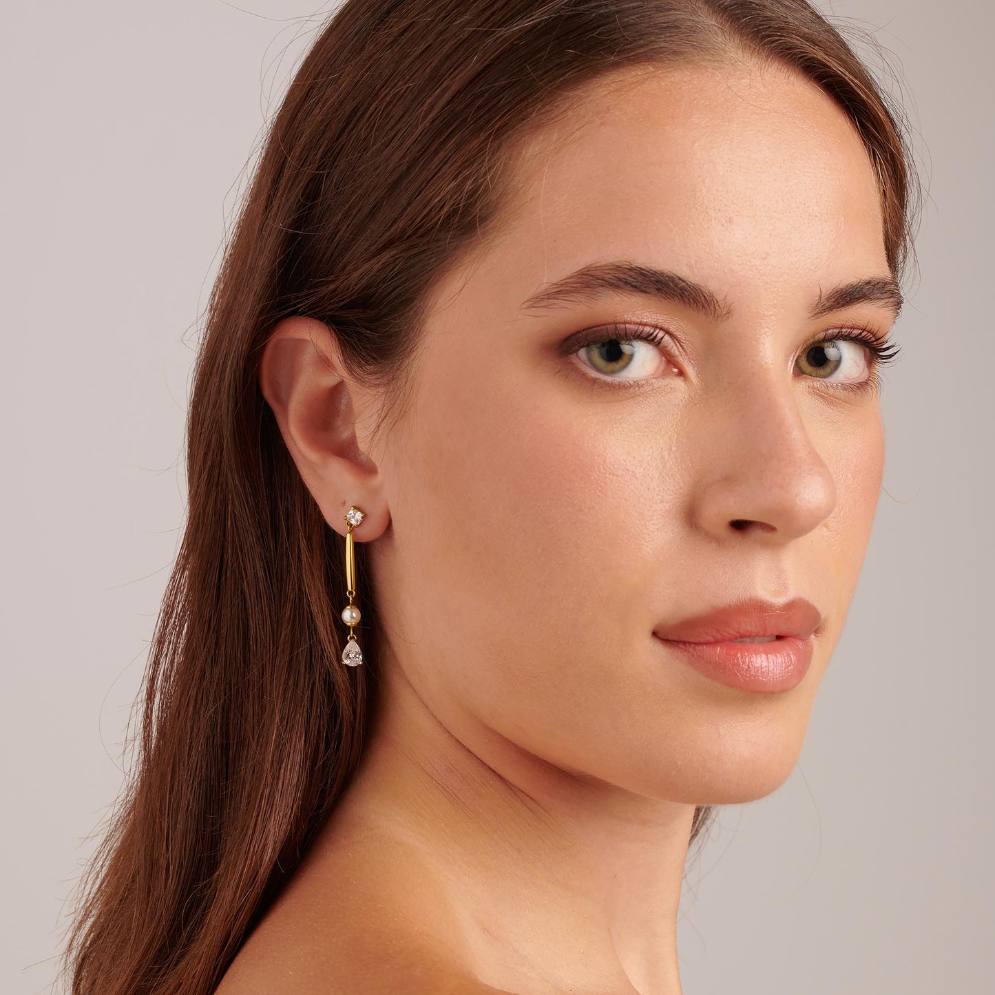 Stainless steel multi-stone and shell-pearl drop earrings, accented with various shaped cubic zirconia finished in 14K gold plating. Theearrings are held with friction posts and backings, completed to a 1.65 inch length.