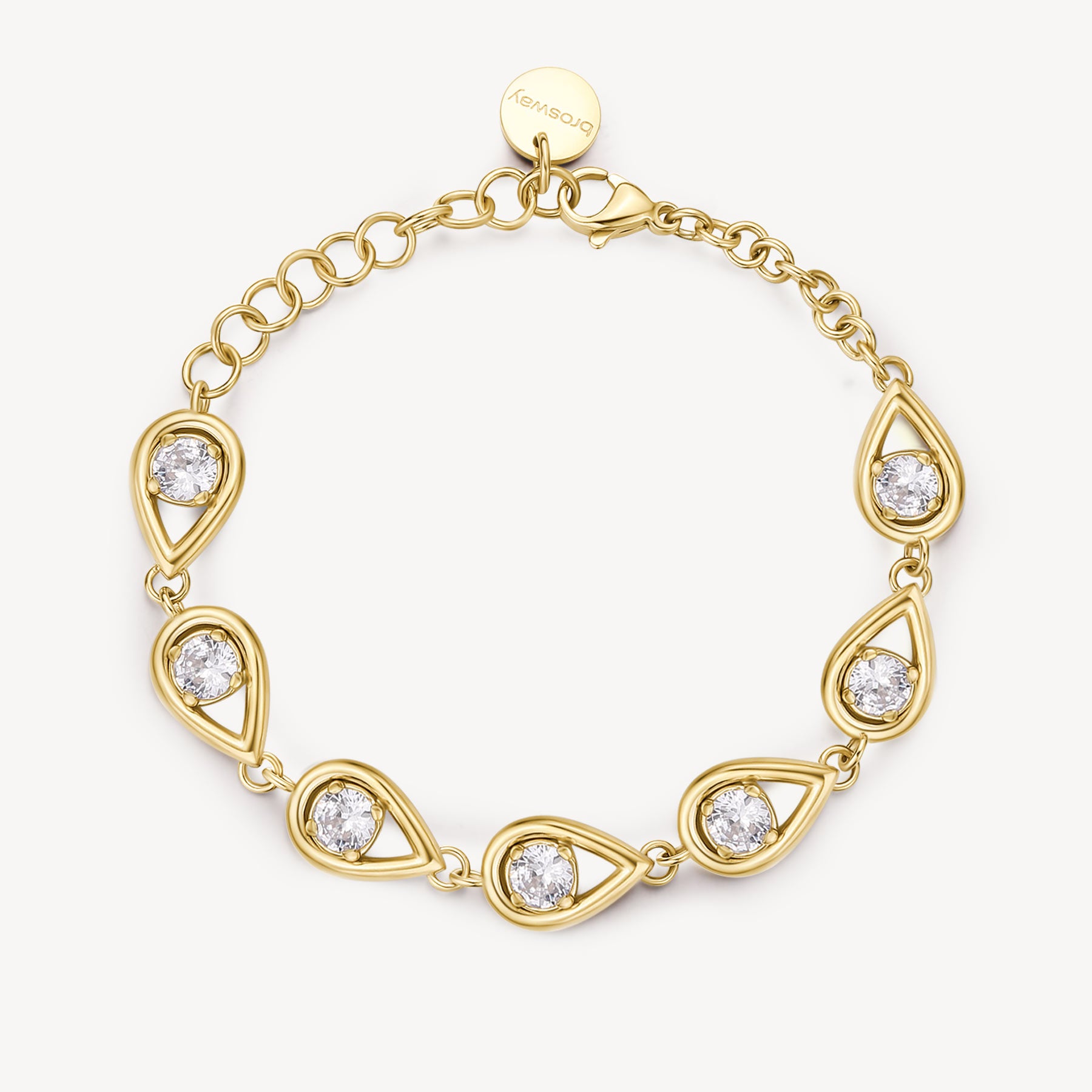 Stainless steel fancy teardrop link bracelet, accented with round cubic zirconia and finished in 14K yellow gold pvd plating. The bracelet is completed to an adjustable 7 inch length.