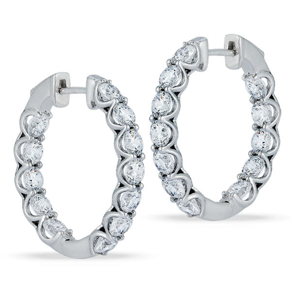 The earrings are fashioned in an oval hoop design, lined with grown diamonds on the front an interior of each earring. They are held with a hinged, post closure and completed in 14K white gold.