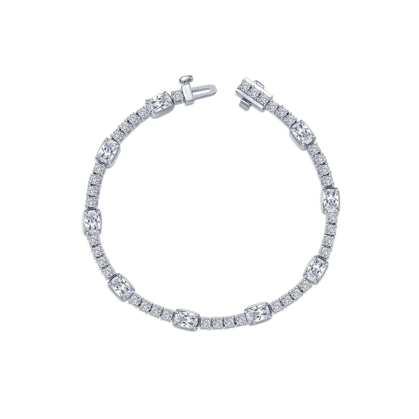 This station bracelet consists of signature Lafonn Lassaire simulated emerald cut diamonds in a tennis style design. The bracelet has stations of prong set cushion shaped stations along the length of the bracelet. The bracelet is completed in sterling silver and bonded with a platinum finish.