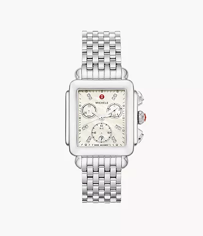 Inspired by the geometric shapes of Art Deco architecture, this iconic stainless timepiece features a Swiss chronograph movement with 12 brilliant hand-set diamonds (0.05 carat weight) along the mother-of-pearl dial with double diamond hour markings and our signature MICHELE crown. A stainless steel seven-link bracelet adds the finishing touch and is interchangeable with any 18mm MICHELE strap.