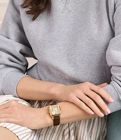 The Deco Sport Mid combines a brown color with refined design. Its 31mm rectangular stainless steel case frames a white sunray dial, accented with polished roman numeral indexes and a sub-second movement. The brown silicone strap, is interchangeable with any 16mm strap from MICHELE's collection, adding versatility to the design.