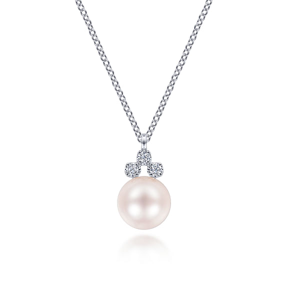 The necklace is fashioned with a single 8.5mm cultured pearl, accented above with three round brilliant cut diamonds. The pendant is held on an adjustable 16-18 inch cable link chain in 14K white gold.