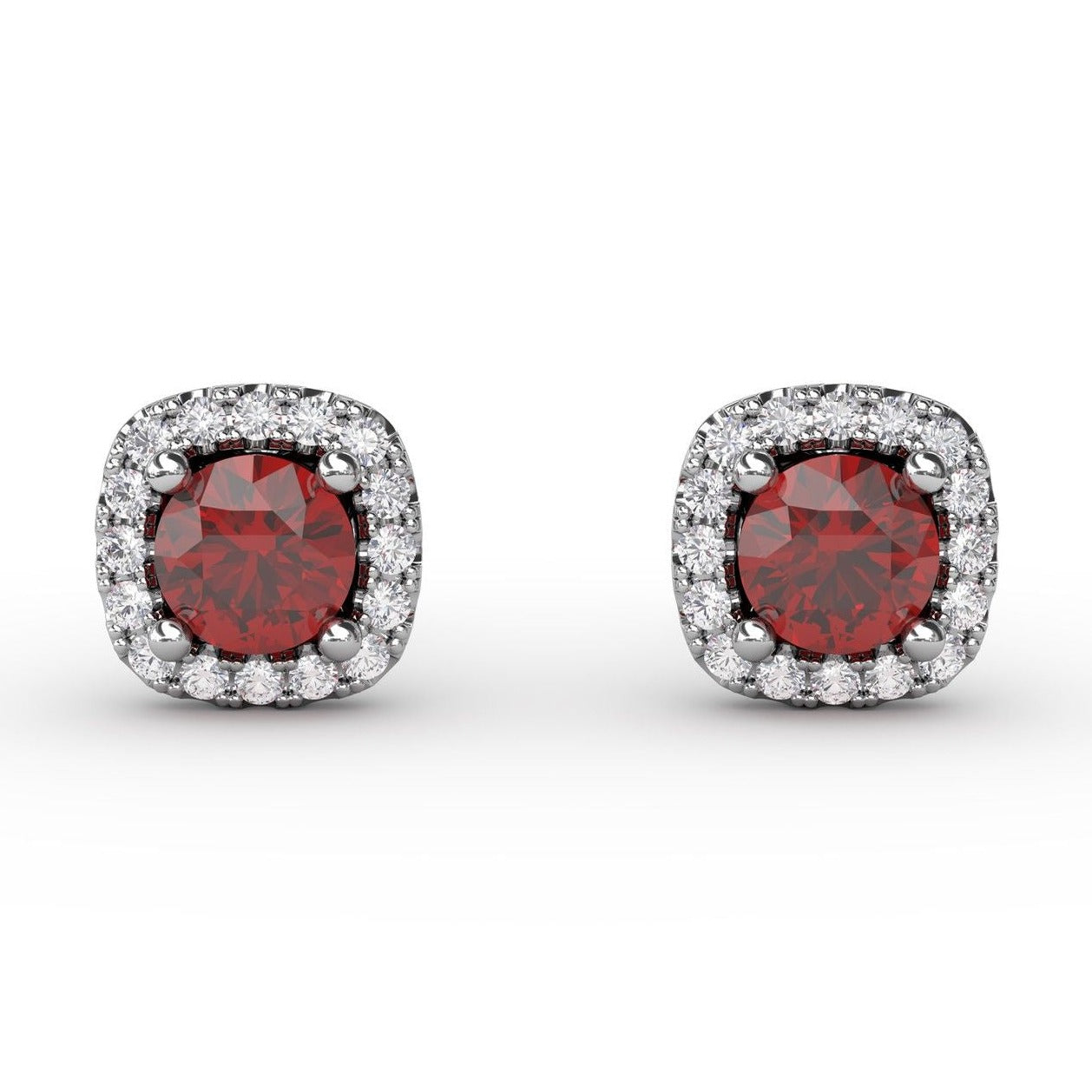 Earrings fashioned in a stud design, featuring round brilliant cut diamonds in a fishtail style, cushion halo design. There is one round ruby four prong set in the center of each stud design. The pair is held with friction posts and backings in 14K white gold.