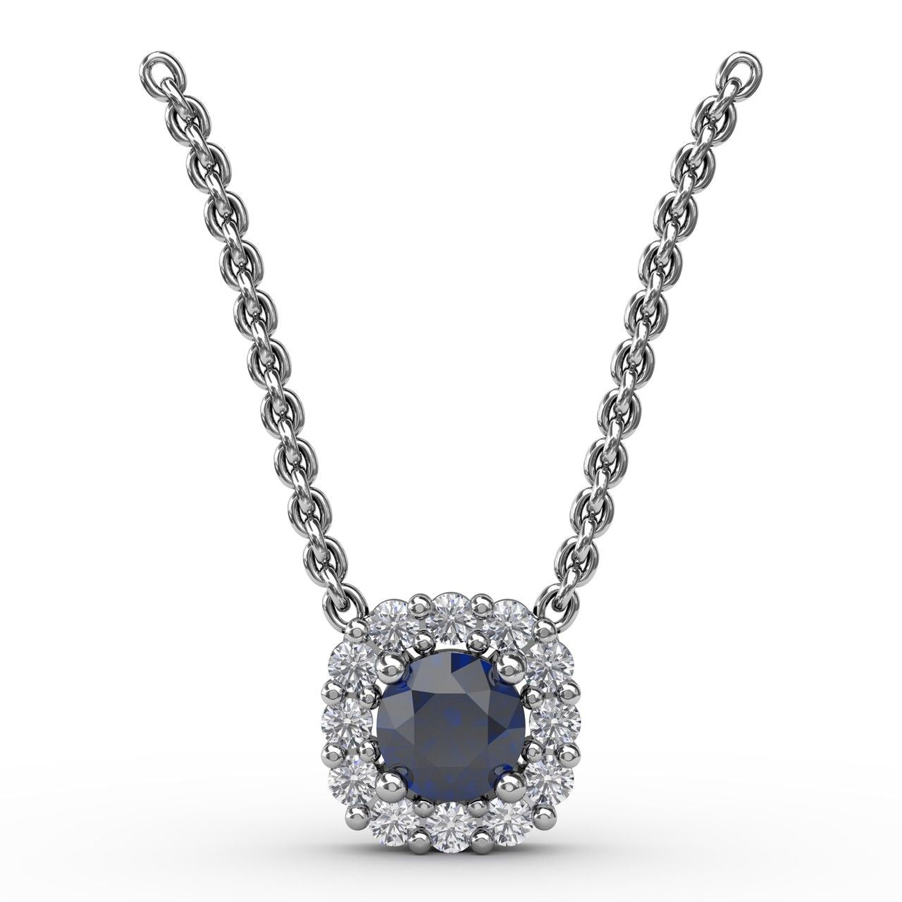 Diamond and Sapphire Halo Necklace in 14K White Gold