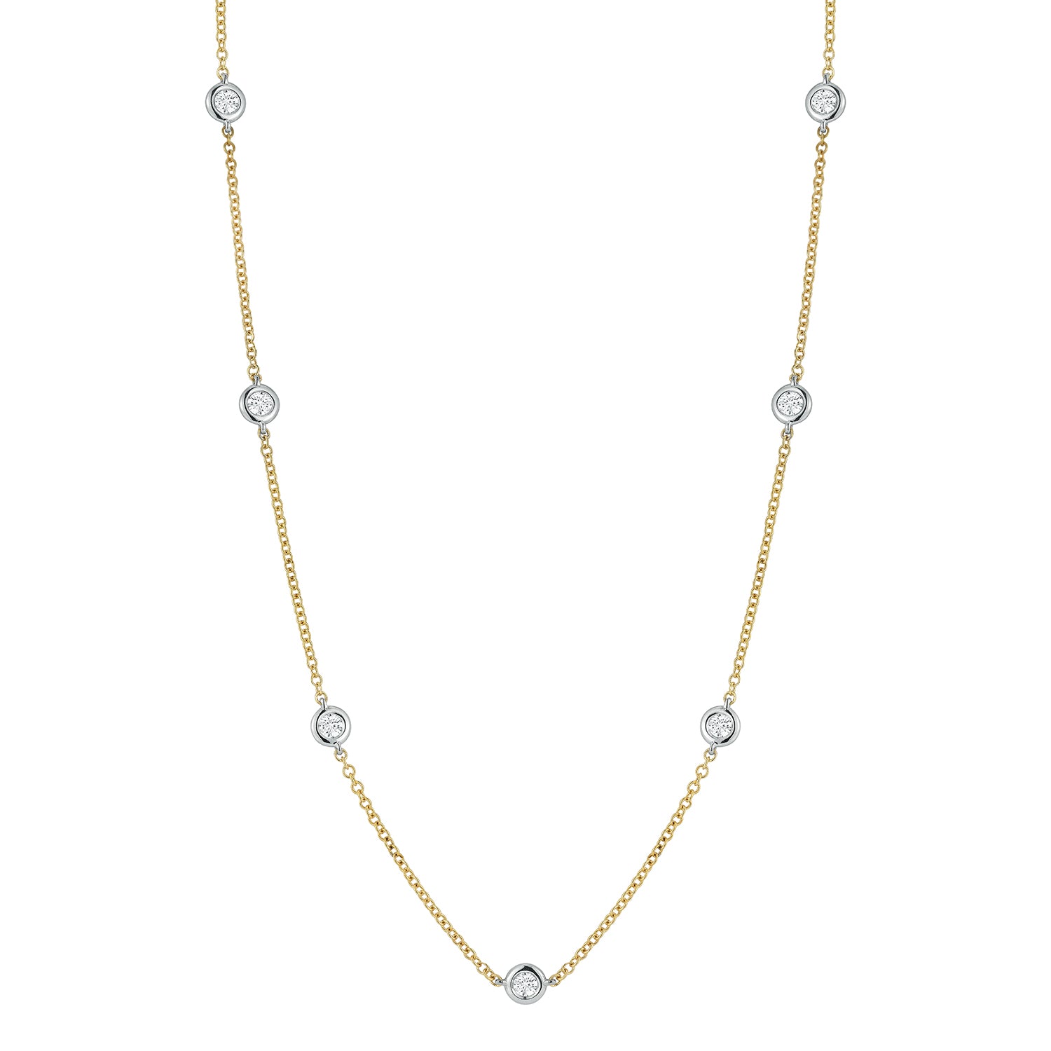 The necklace consists of all round brilliant cut diamonds in single bezels, stationed evenly along the length of the chain in 14K white gold. The bezels are connected with a cable link chain, completed to an 18 inch length in 14K yellow gold.