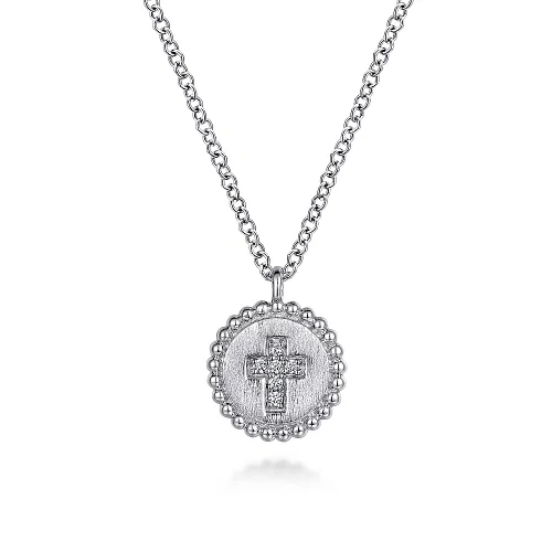 The necklace is fashioned with a satin finish beaded disc. The pendant is accented with diamonds in a cross shape at the center. The pendant is held on an adjustable 17.5 inch cable link chain in sterling silver.
