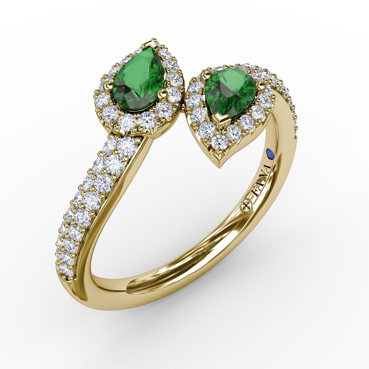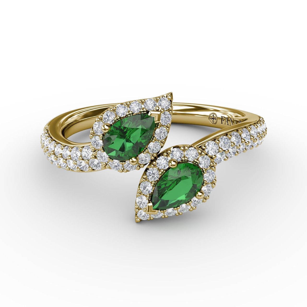 The ring is fashioned in an open top, slight bypass design. Each end is set with a pear shaped emerald and surrounded by a halo of round brilliant cut diamonds. The diamonds travel halfway down each side of the ring, completed in a high polished finish in 14K yellow gold.