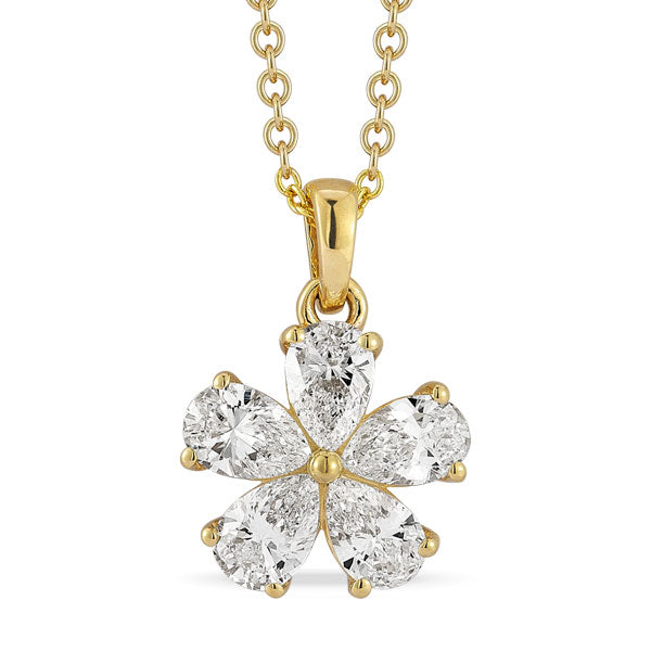 The pendant is fashioned in a floral motif, consisting of five pear shaped lab grown diamonds total. The pendant is held on a singular solid bail on an adjustable cable link chain in 14K yellow gold.