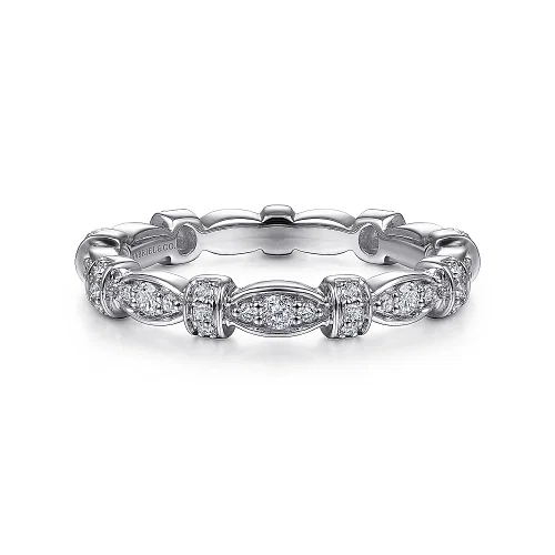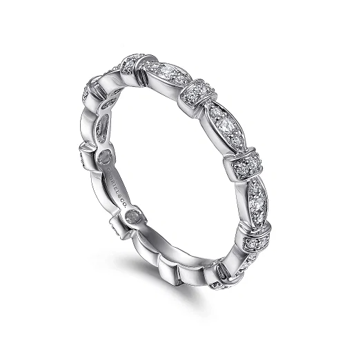The band is fashioned in a straight line design, accented with alternating geometric stations that are bead set with round brilliant cut diamonds. The band is completed with a high polished finish in 14K white gold.