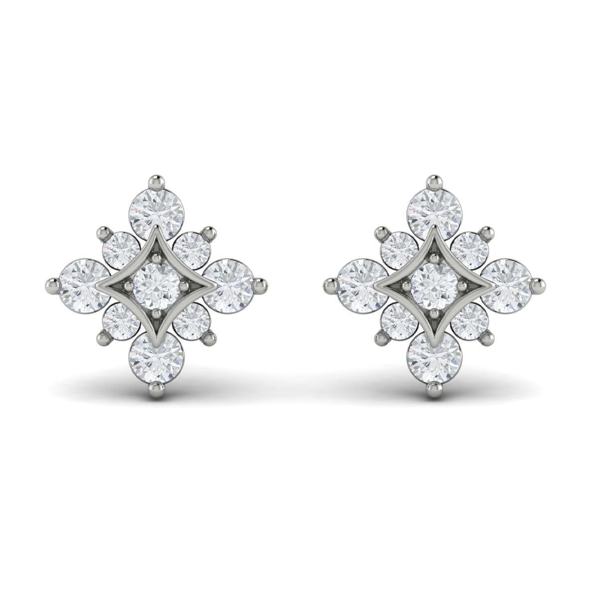 These earrings are fashioned in a halo style 'starburst' diamond stud. The pair is held with friction posts and backings in 14K white gold.
