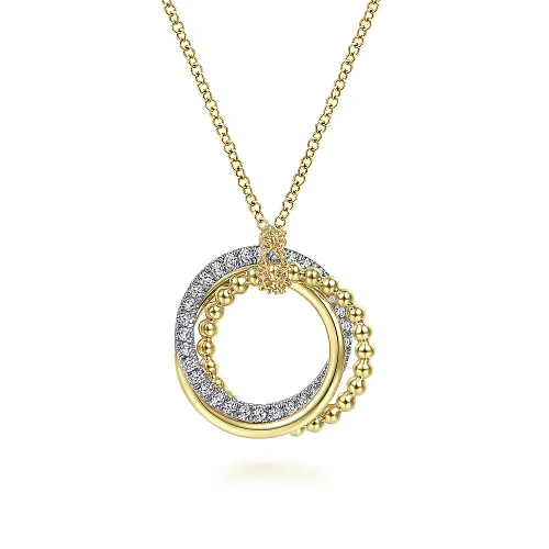 The necklace is fashioned in a multi-ring design, featuring round brilliant cut diamonds, a plain ring and a beaded ring that all interlock. The pendant is held on an adjustable 17.5 inch cable link chain in 14K yellow gold.