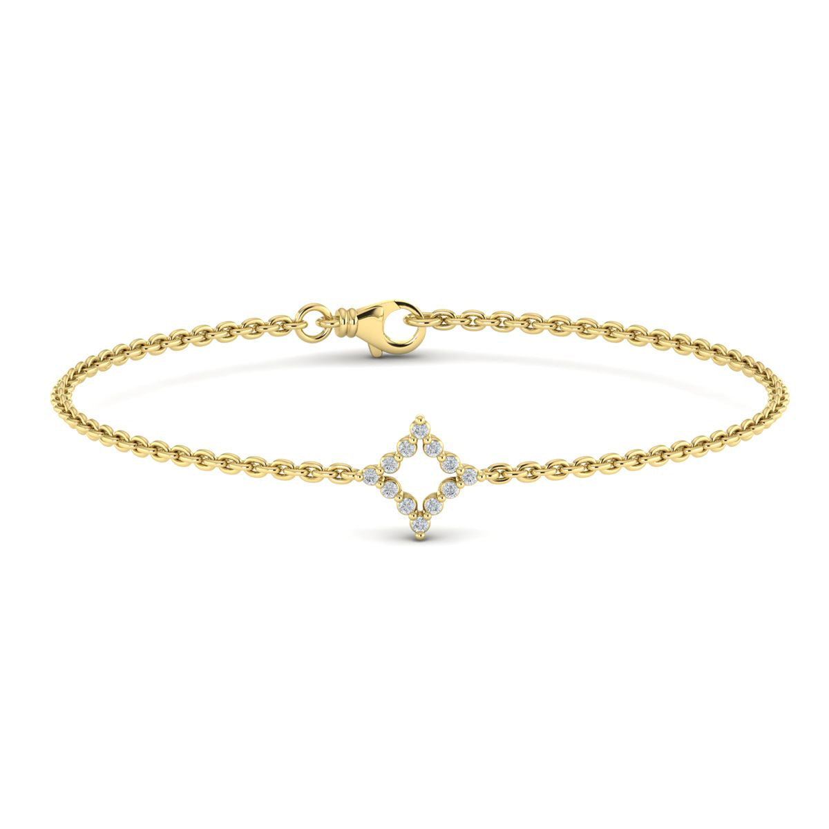 This bracelet is fashioned with a single, open diamond shaped 'burst' design that is lined with round brilliant cut diamonds. The bracelet is completed with a cable link chain to a 7 inch length in 14K yellow gold.