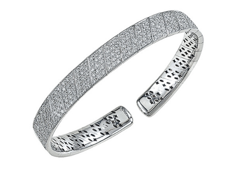 The bangle is fashioned in a slightly oval design with an open bottom. The bangle is pave set across the entire top with round brilliant cut diamonds. The bangle is finished in 18K white gold with a high polished finish.
