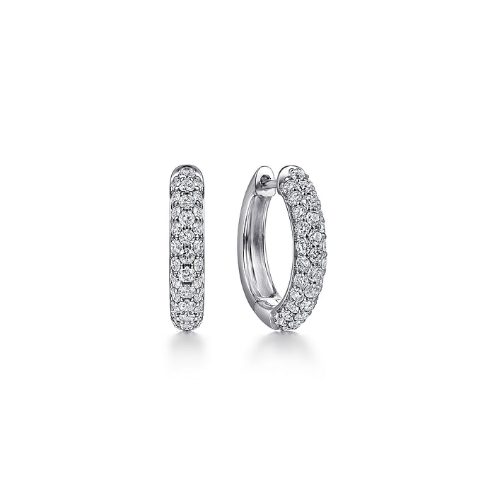 The earrings are fashioned in a 15mm huggie hoop design. The pair is fronted with a pave style setting completed with round brilliant cut diamonds. The pair is hinged with a post closure, completed in 14K white gold.