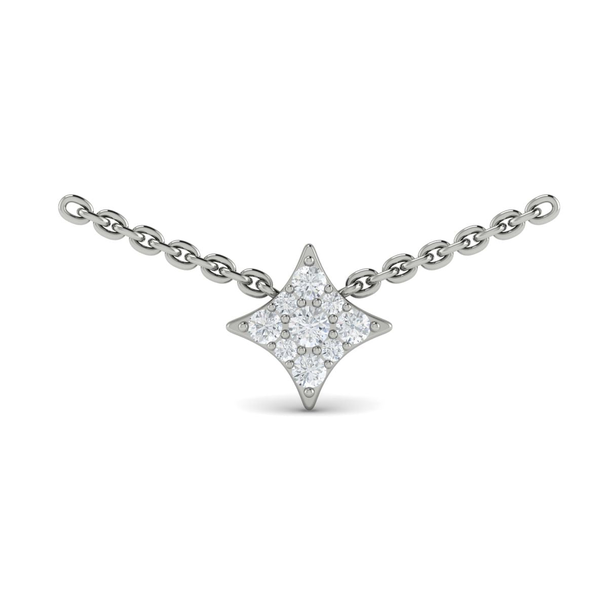 The necklace is fashioned in a diamond shaped 'burst' design, pave set with round brilliant cut diamonds. The pendant is held on an adjustable 16-18 inch cable link chain in 14K white gold.