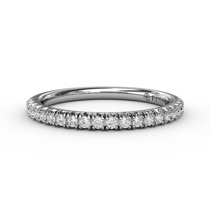 The band consists of all round brilliant cut diamonds. The diamonds are French set in a straight line design halfway around the band, completed in a high polished finish in 14K white gold.
