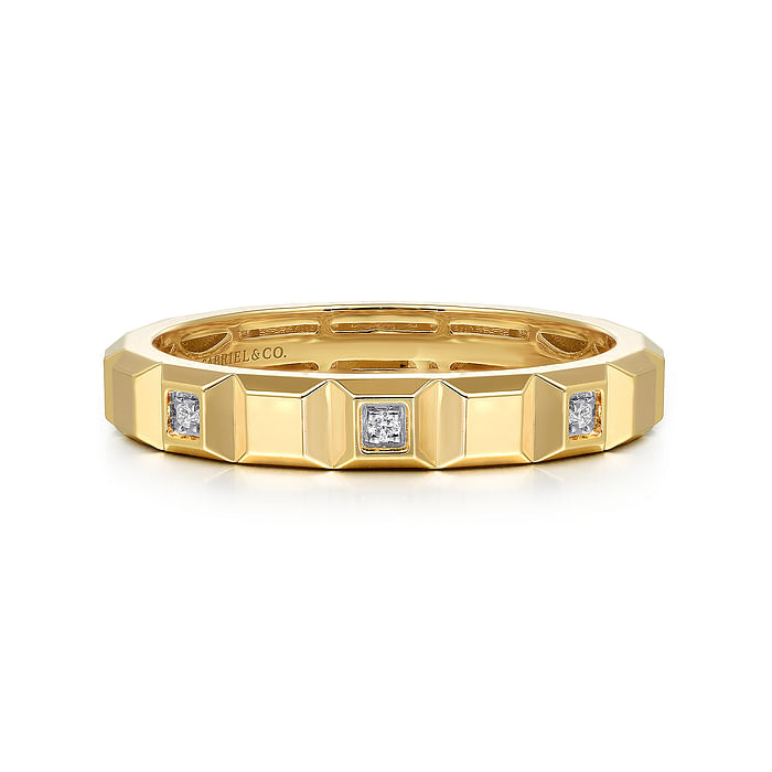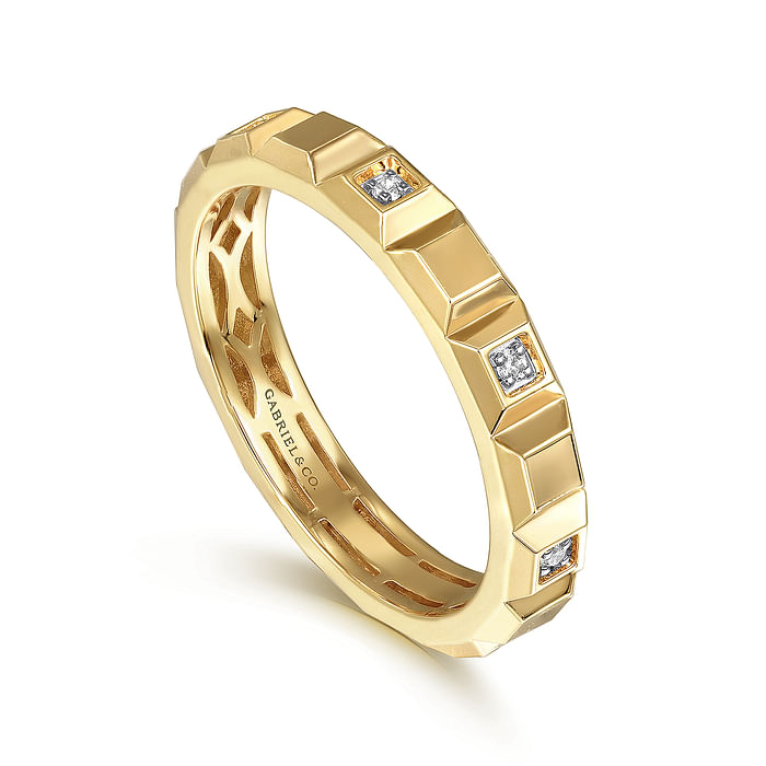 The band is fashioned in a wider stackable design, accented with raised 'pyramid' sections across the top half. There are alternating high polished and diamond accented stations around the band.