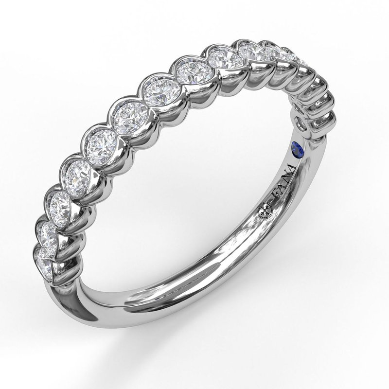 The band consists of all round brilliant cut diamonds. The diamonds are scalloped half bezel set across the top half of the band, completed in a high polished finish in 14K white gold.