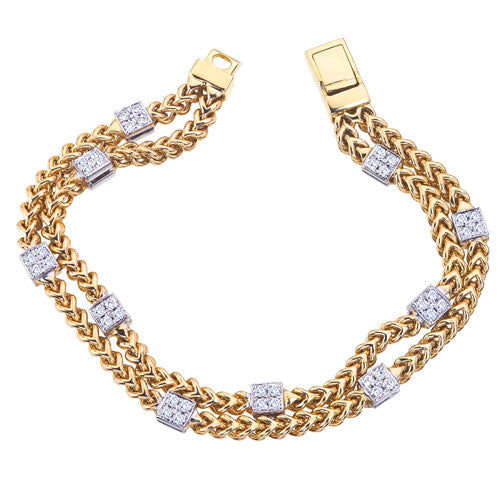 The bracelet is fashioned in a double-row design, featuring square stations that are pave set with round brilliant cut diamonds in 14K white gold. The stations are connected with a double-row signature weave chain link in 14K yellow gold, held with a hidden closure and completed to a 7 inch length.