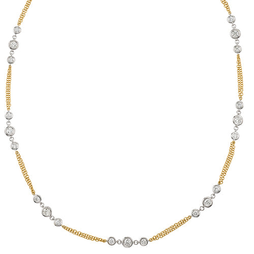 This necklace is fashioned in a three-stone station design, featuring graduated bezel set round brilliant cut diamonds. The diamonds are all set in white gold and separated by a double strand of cable link chain in 14K yellow gold. The necklace is completed to an 18 inch length.