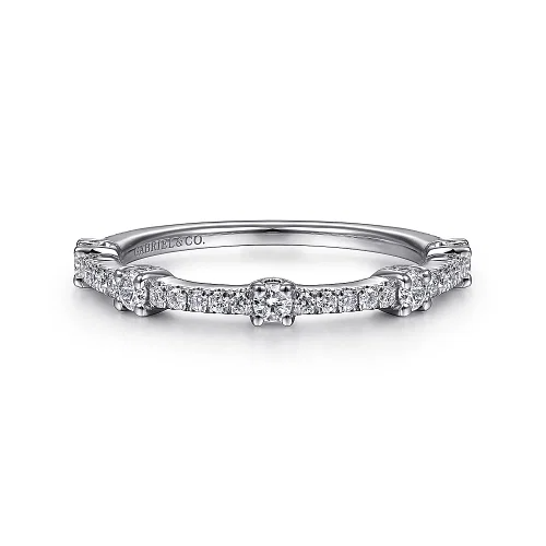 The band is fashioned in an alternating station design, set with a straight line of round brilliant cut diamonds. The band is completed in a high polished finish in 14K white gold.