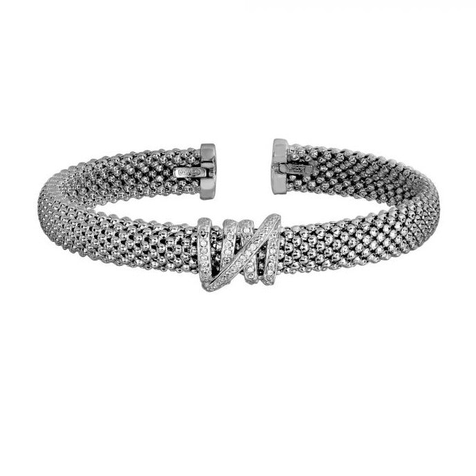 This bangle is fashioned in sterling silver in a popcorn bangle design. The bangle has an open bottom cuff and is accented with a free form diamond bar top. The bangle is 8mm in width.