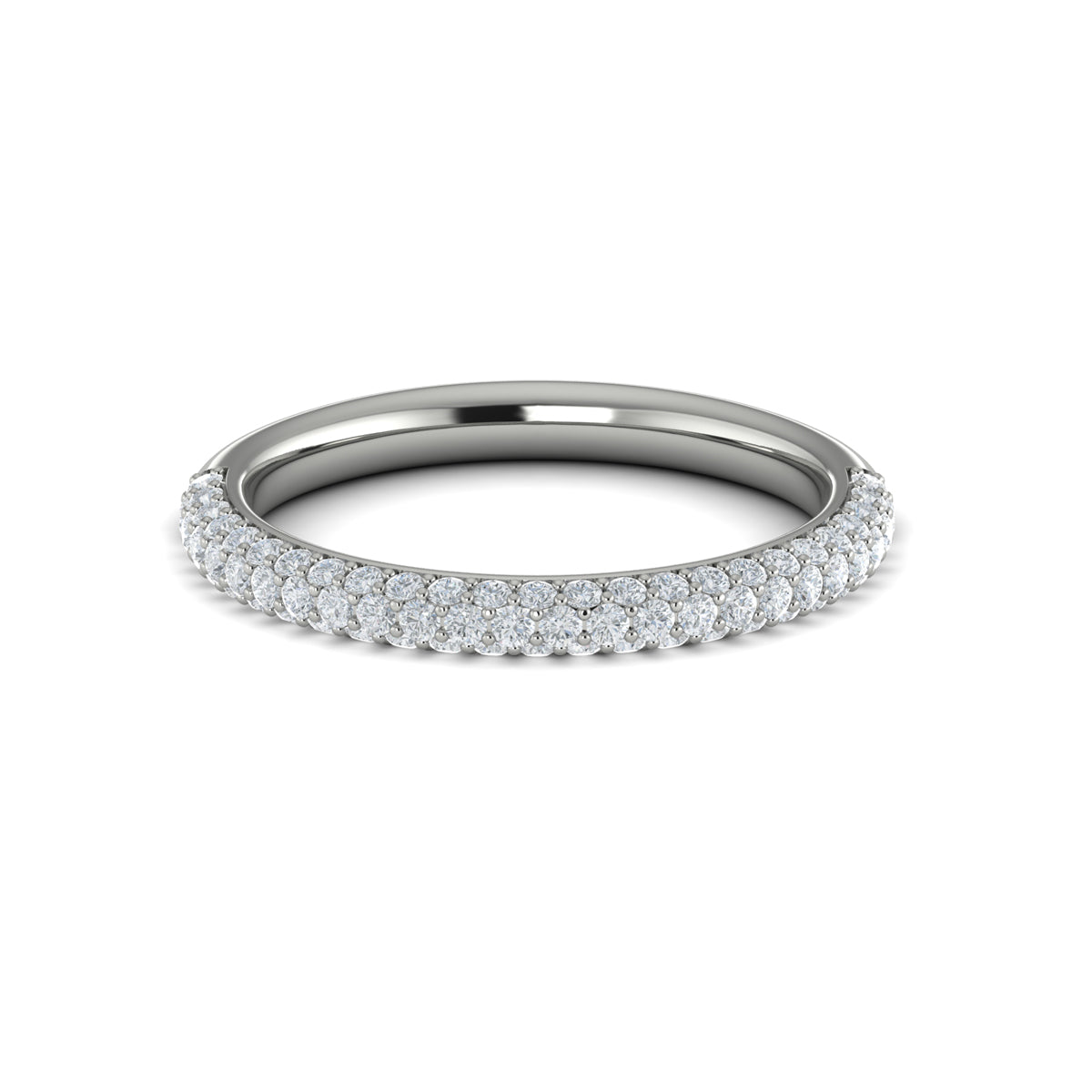 The band is fashioned with all round brilliant cut diamonds. The diamonds are pave set in a slightly domed, three-sided design. The stones span halfway across the band which is completed in a high polished finish in 14K white gold.