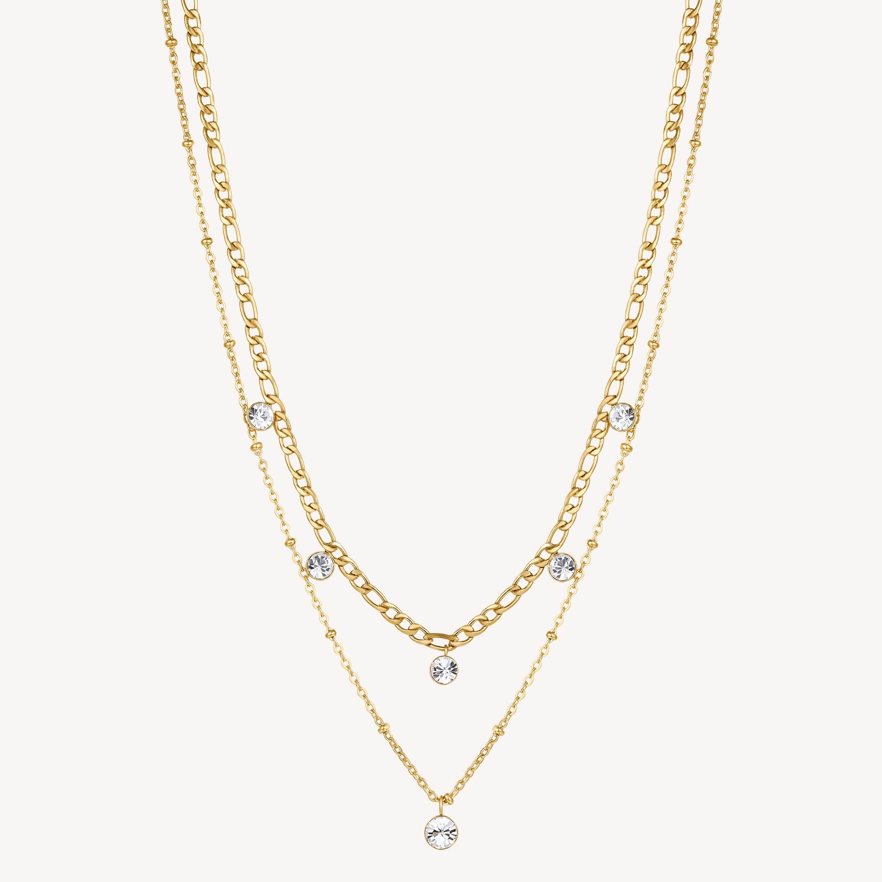Stainless steel double-layer necklace featuring a figaro inspired chain with crystal stations and a beaded chain with a crystal drop. The necklace is completed to an adjustable 19 inch length, finished in 14K gold plating.