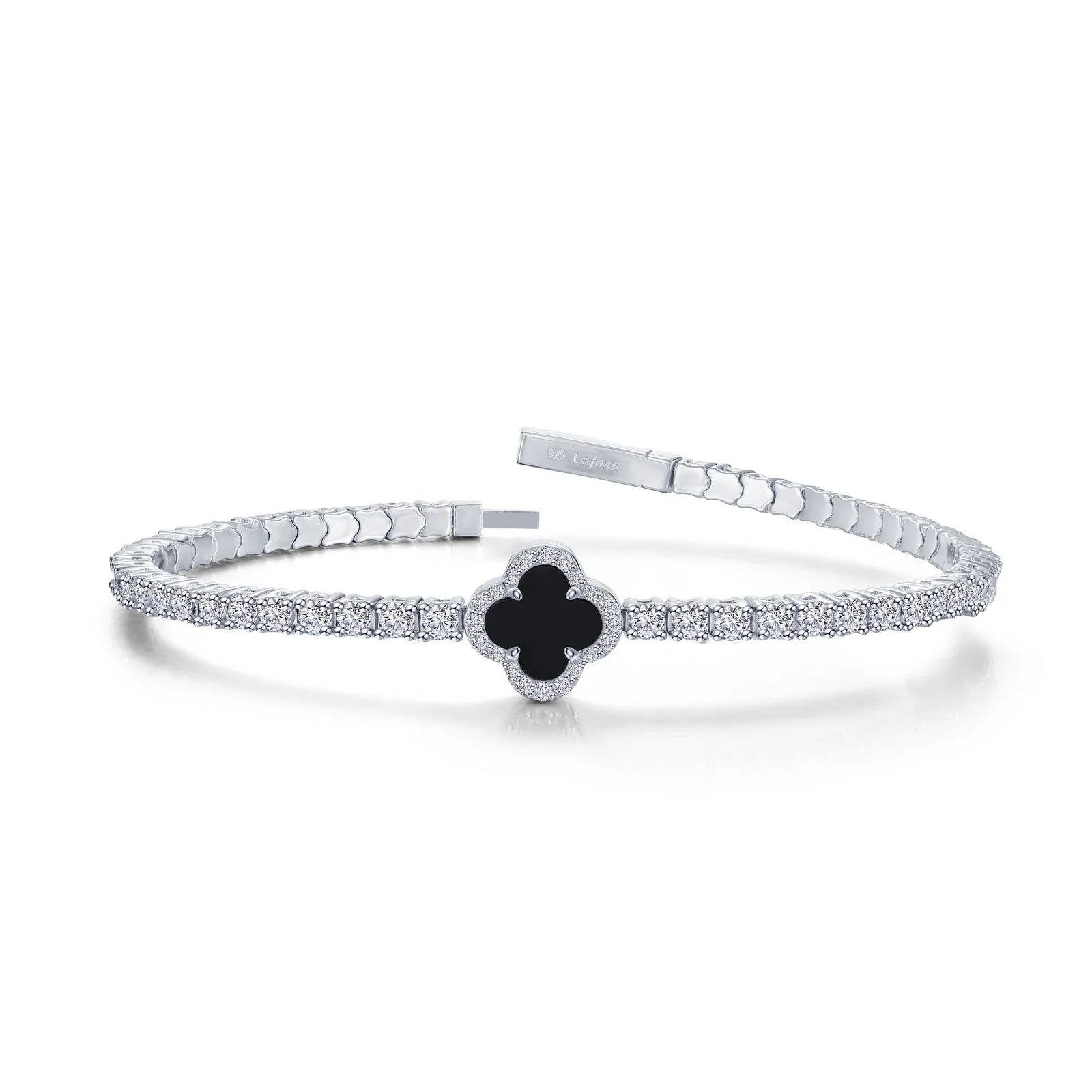 This station bracelet consists of signature Lafonn Lassaire simulated diamonds and a single black onyx clover station. The bracelet is fashioned in a flexible design, held with a hidden push closure. The bracelet is completed in sterling silver and bonded with a platinum finish.