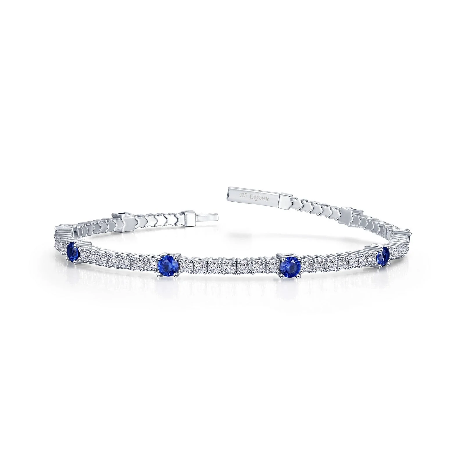 This station bracelet consists of signature Lafonn Lassaire simulated diamonds and stations of larger lab-grown blue sapphires. The bracelet is fashioned in a flexible design, held with a hidden push closure. The bracelet is completed in sterling silver and bonded with a platinum finish.
