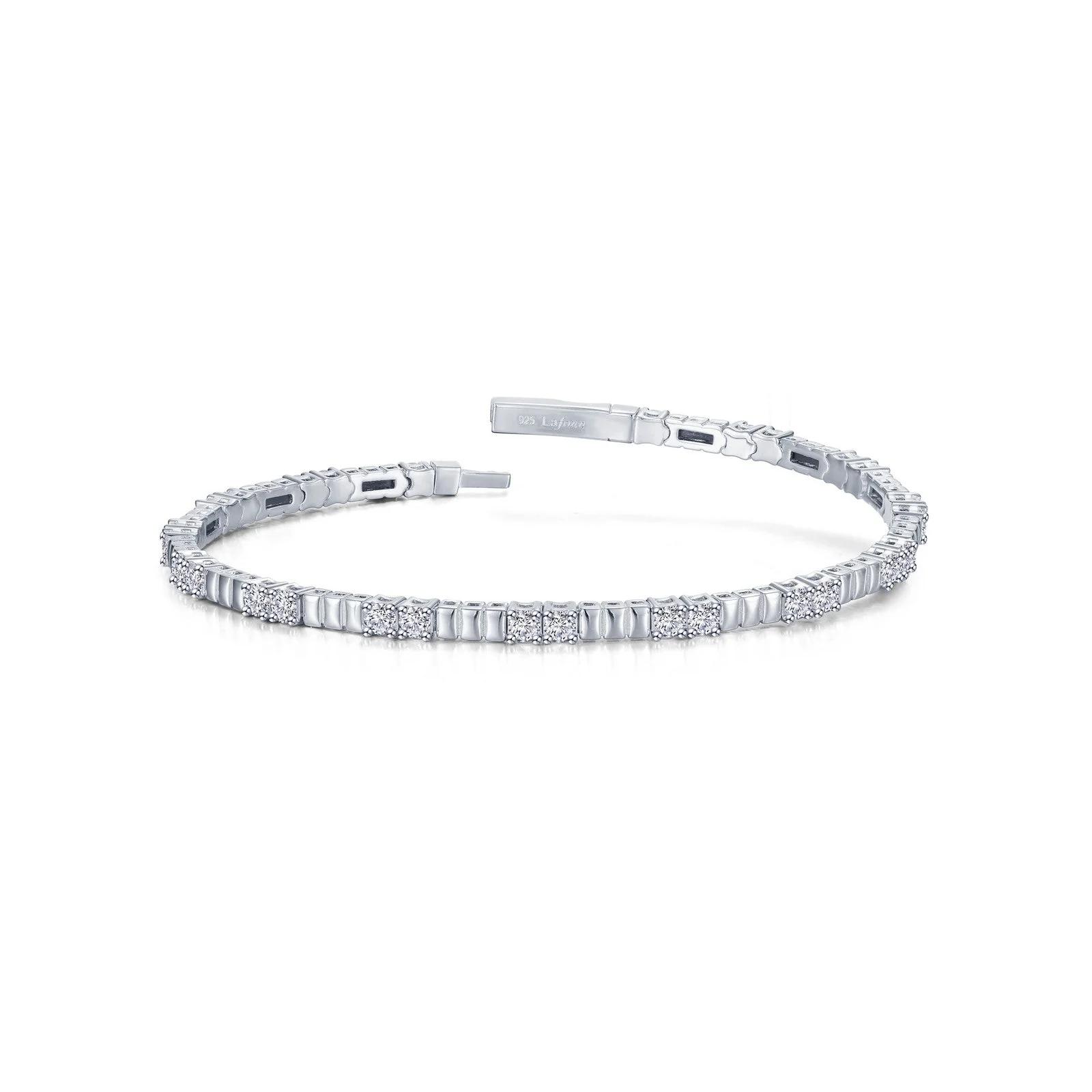 This station bracelet consists of signature Lafonn Lassaire simulated diamonds and is accented with ribbed stations of silver. The bracelet is fashioned in a flexible design, held with a hidden push closure. The bracelet is completed in sterling silver and bonded with a platinum finish.