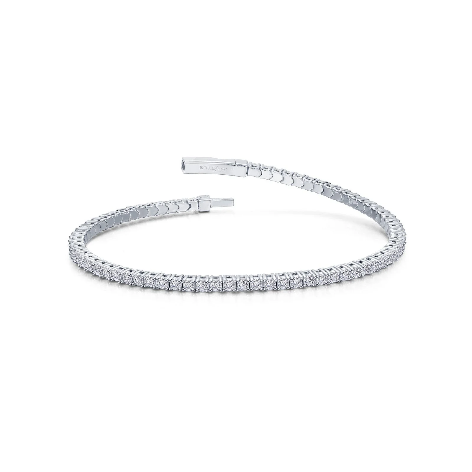 This tennis bracelet consists of signature Lafonn Lassaire simulated diamonds. The bracelet is fashioned in a flexible design, held with a hidden push closure. The bracelet is completed in sterling silver and bonded with a platinum finish.