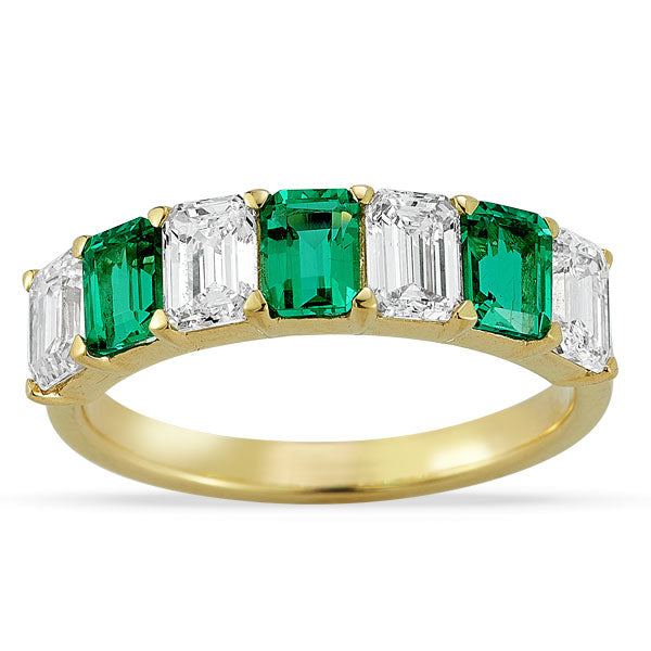 The band is fashioned in an alternating common prong design, featuring emerald cut grown green emeralds and emerald cut lab grown diamonds. The band is completed in a high polished finish in 14K yellow gold.