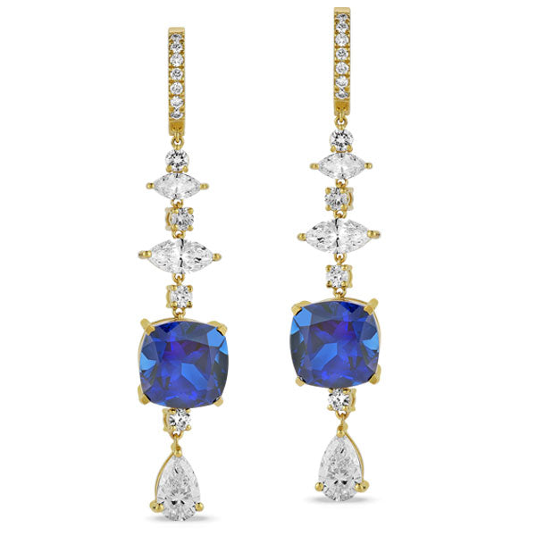 The earrings are fashioned in a fancy multi-drop design. The pair features a cushion shaped lab grown blue sapphire and various shaped lab grown diamonds. The pair is held with a hoop hinged closure and is completed to approximately 2 inches in 14K yellow gold.