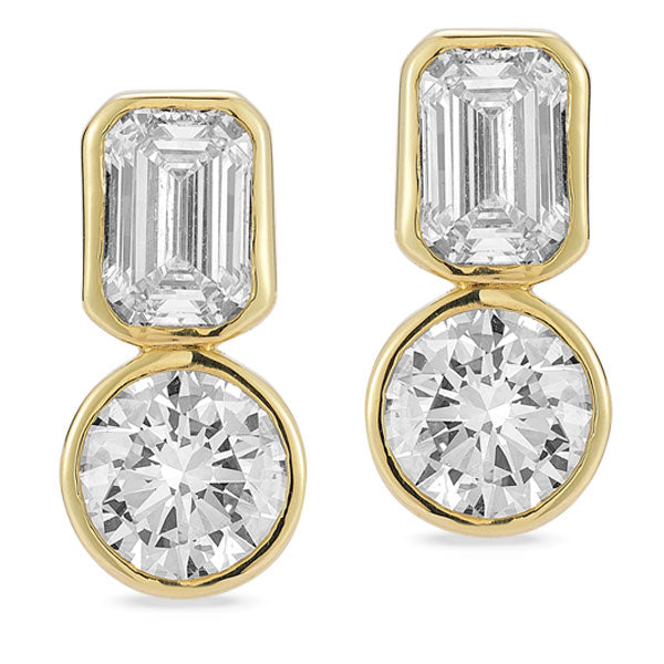The pair is fashioned in a stud drop design, holding two bezel set emerald cut lab grown diamonds and two round brilliant cut bezel set lab grown diamonds. The pair is held with a friction post and backing in 14K yellow gold.