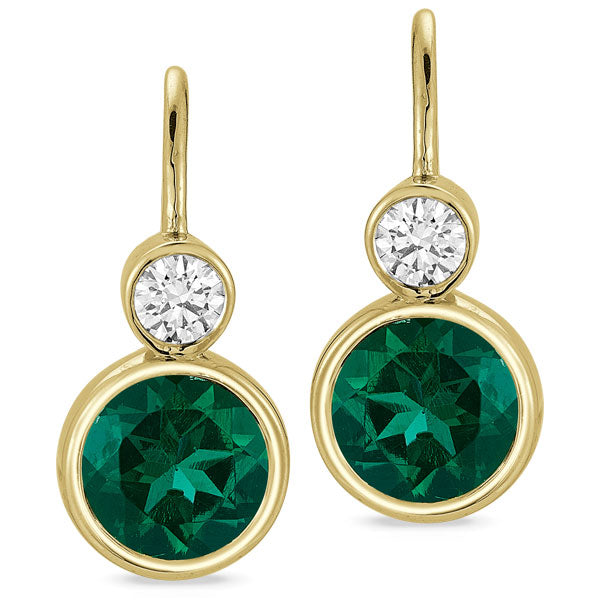 The earrings are fashioned in a graduated drop design featuring a petite lab grown round diamond that is bezel set above a larger bezel set round grown green emerald. The pair is held with latch hook closures.