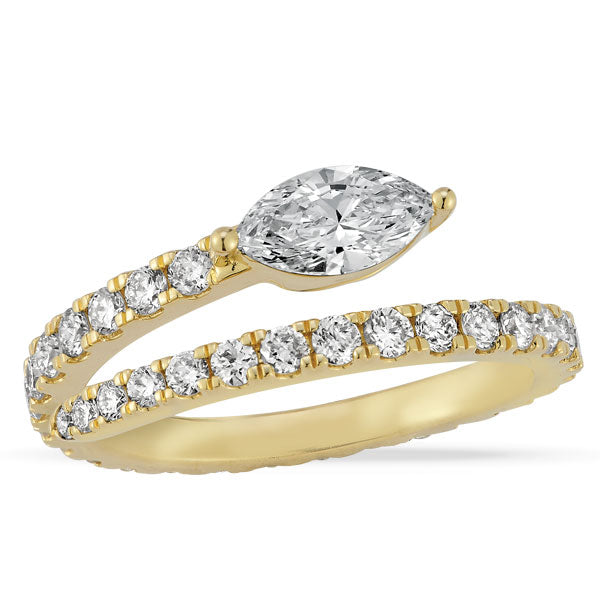 The band features marquise and round brilliant cut lab grown diamonds. The band is fashioined in a bypass design with one end prong set with the marquise shaped diamond. The remainder of the band is accented with round diamonds, traveling halfway down each side. The band is completed in 14K yellow gold.